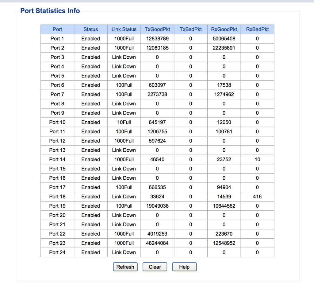 So what does a managed switch buy you, the home user? The biggest bennefit to me has been the web interface with built in port monitoring. Twice in the last year it has detected a problem in my network hardware that I wouldn’t have been aware of. Lets look at the output: