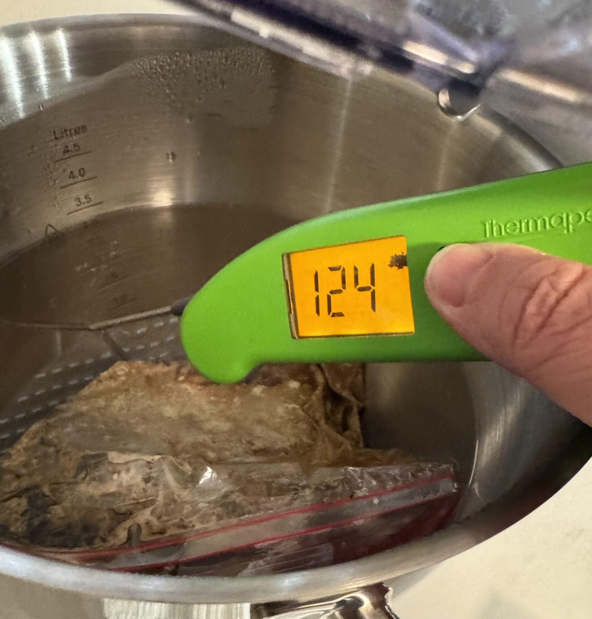 We set the temp to 51°C (123.8°F) in both cases and let them go for 4 hours. This should be enough to make the meat tender and medium after the quick grill at the end. I checked on them both regularly, I’ve done sous vide in the Instant Pot for years so I know those results come out well. The Kenwood did really well. The temp of the water was right around 51°C (you can see in the photo 124°F) Every time I checked it was within a degree.